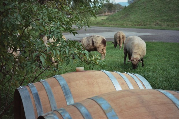 In 2003, we started to produce our first wine and were looking for a suitable accommodation facility (shelter). Finally, we came across an ammunition bunker built by the Canadian Air Force in the 1960s which was for rent, layered with a thick grassy carpet in a picturesque setting with occasional flocks of sheep coming by to mow the grass. Behind thick concrete walls and a heavy iron door we set up our winemaking equipment and some new French oak barrels to produce our first wine.